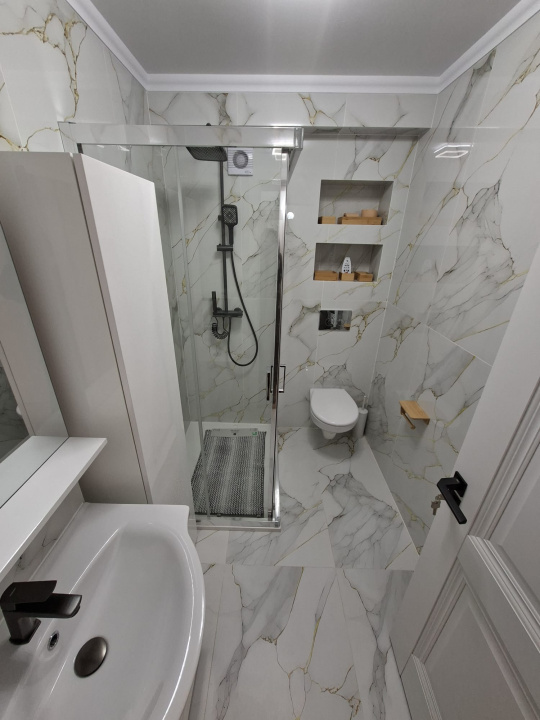 Design: Finisaje premium, design modern și minimalist, parchet de calitate superioară și placări ceramice tip marmură în baie și bucătărie.