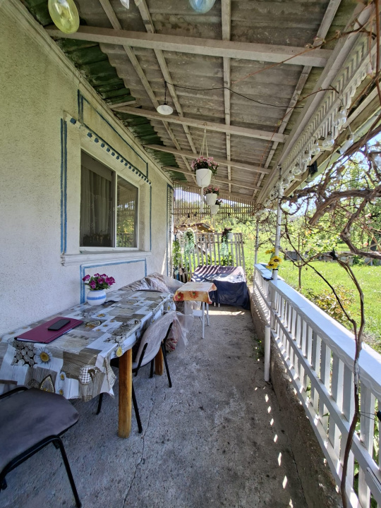 Proprietatea dispune de o prispă acoperită, amenajată ca zonă de relaxare, și o curte cu mult spațiu verde. Exteriorul casei păstrează elemente decorative tradiționale, oferind un aspect autentic și îngrijit.