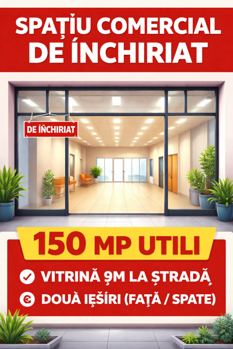Se oferă spre închiriere spațiu comercial cu suprafața de 150,5 mp, situat în zona RFN, cu vitrină generoasă de 9 metri, ideală pentru vizibilitate maximă.