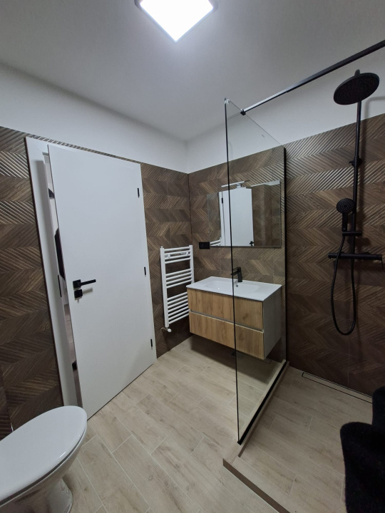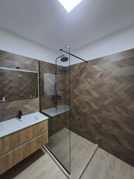 Baie modernă și practică: Dușul este de tip „walk-in” (fără cădiță înaltă), mult mai ușor de curățat și cu un aspect deosebit.