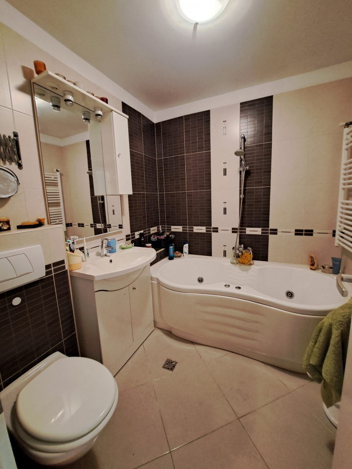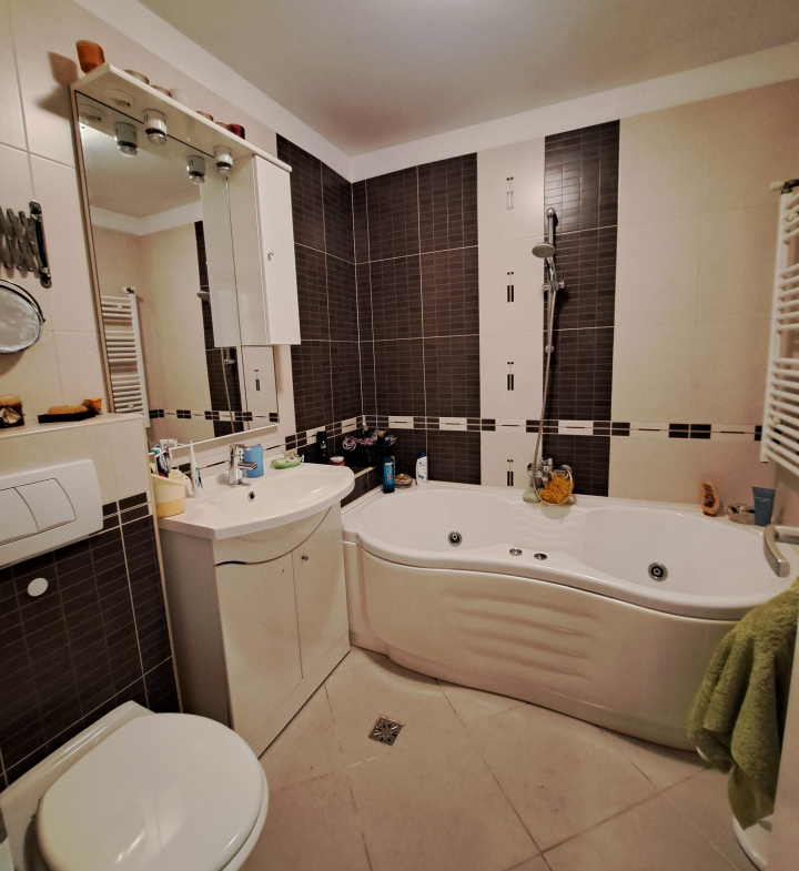 2 băi (una necesită reamenajare, fiind folosită ca spațiu tehnic pentru mașina de spălat)