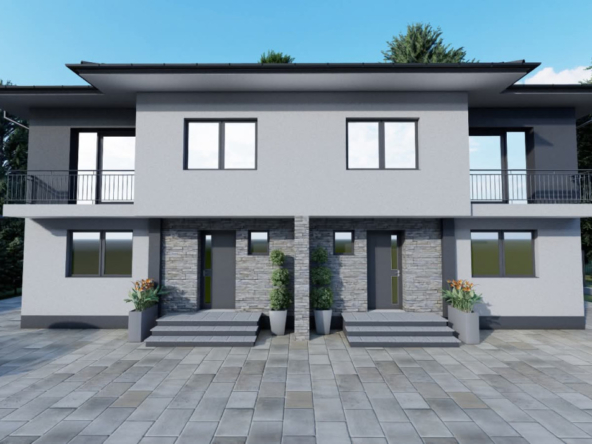 – Parter: bucatarie, living cu dinning open space, baie, birou, hol si 2 terase una in fata si una in spatele casei;