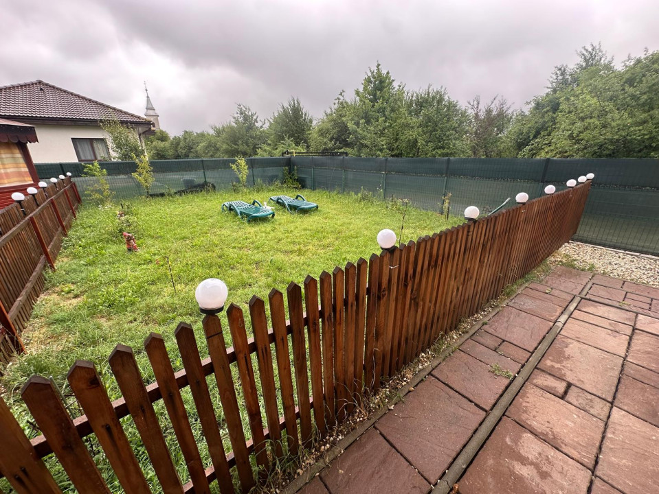 Curtea este amenajata cu pavaj si pietris decorativ, are o mini gradina, iar zona de BBQ cu foisor completeaza spatiul exterior.