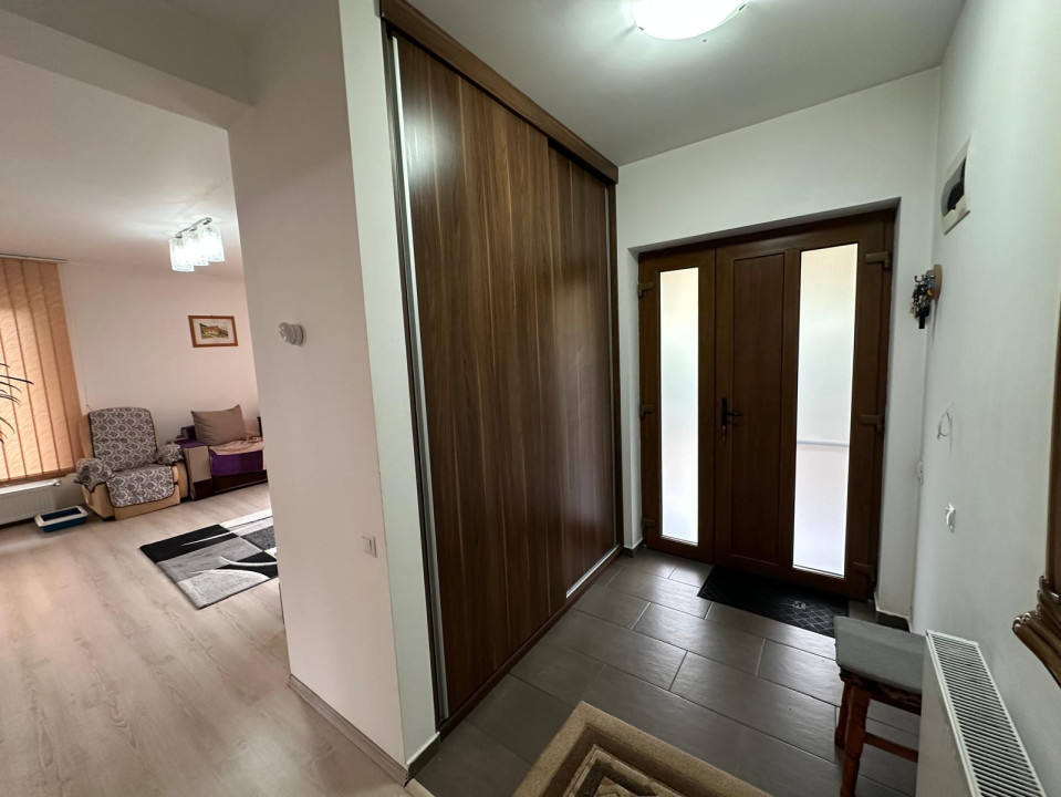 Compartimentarea este practica si bine gandita: living, bucatarie cu acces direct pe terasa acoperita, 3 dormitoare (dintre care unul matrimonial cu baie proprie), inca o baie, hol amenajat cu dulap tip dressing si un garaj spatios. Pe langa garaj, exista si un loc acoperit unde se poate parca o masina in plus.