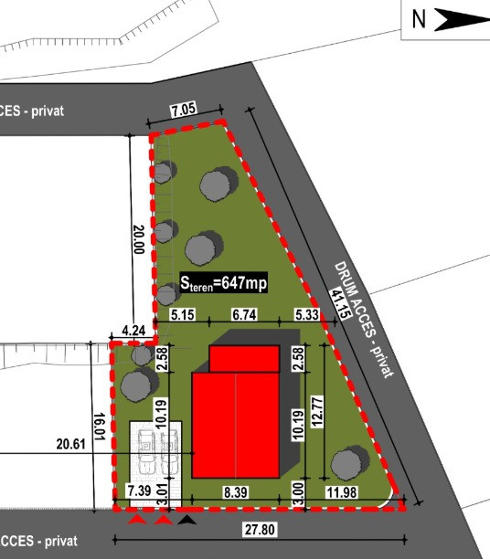 Parcela are o suprafață de 647 mp, este intabulată și dispune de acces privat cu drept de servitute, având cota de 2/10 (171 mp), conform Extrasului CF. Accesul se face pe un drum cu lățime de 6 m.
